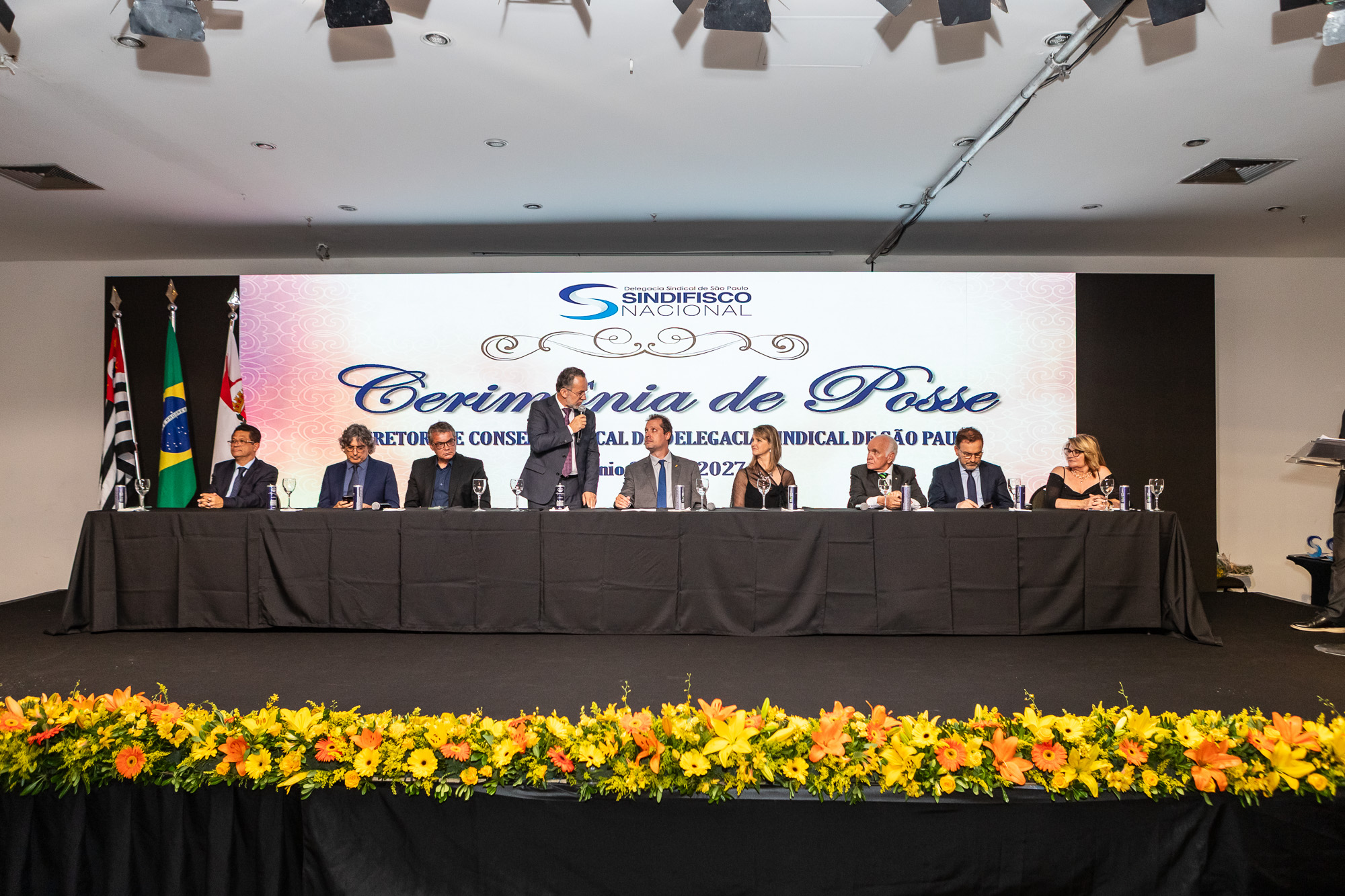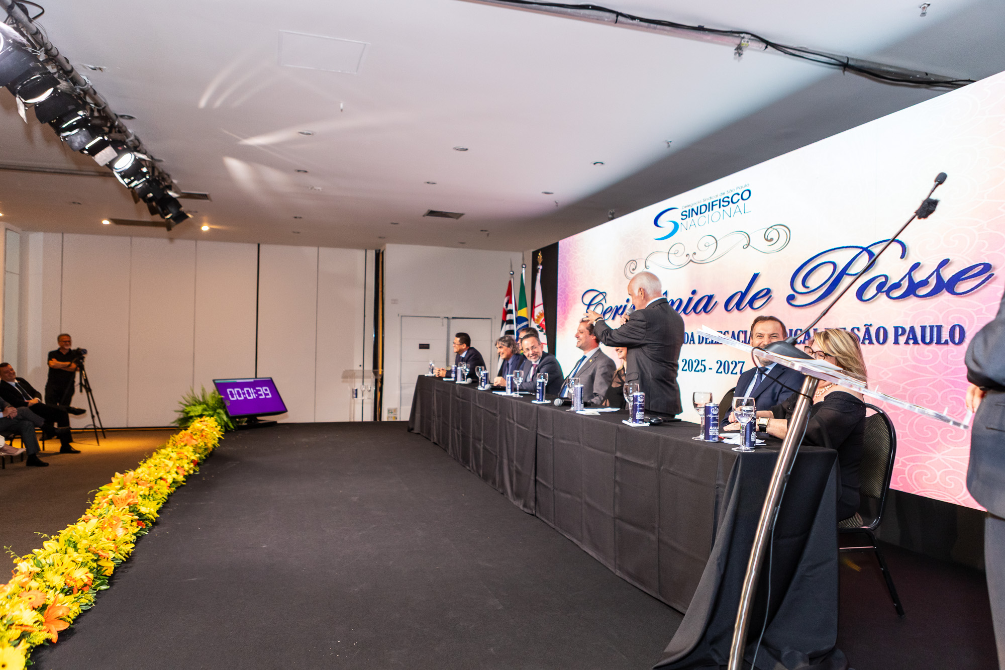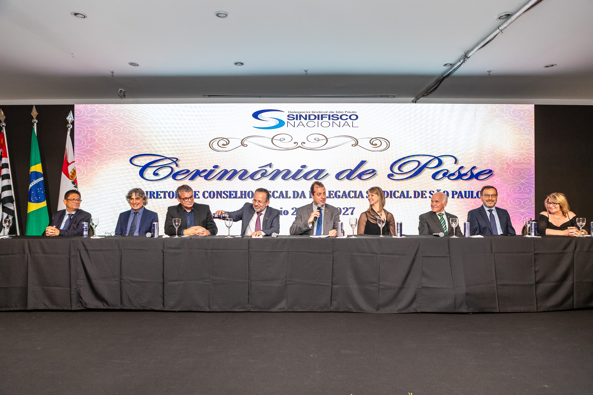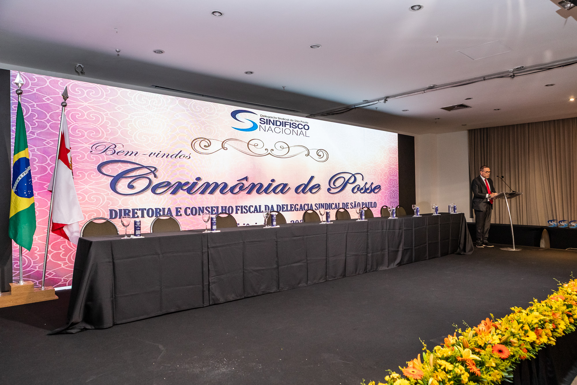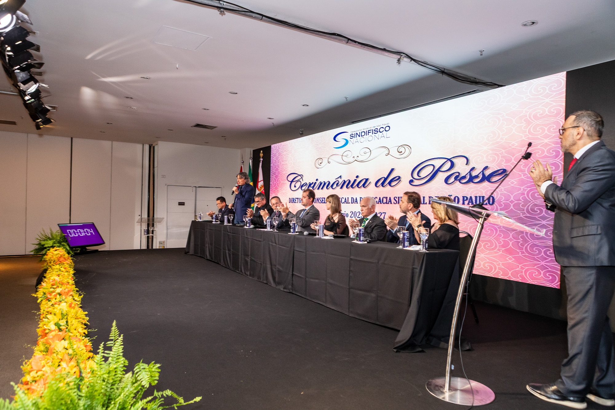 Para compor a mesa diretora, foram chamados ao palco o Presidente da DS/SP do Sindifisco Nacional, Auditor-Fiscal Gabriel Rissato Leite Ribeiro; o Presidente da Diretoria Executiva Nacional (DEN) do Sindifisco Nacional, Auditor-Fiscal Dão Real Pereira dos Santos; a Superintendente da 8ª Região Fiscal, Auditora-Fiscal Márcia Cecília Meng; e o Corregedor da Receita Federal, Auditor-Fiscal Guilherme Bibiani Neto.