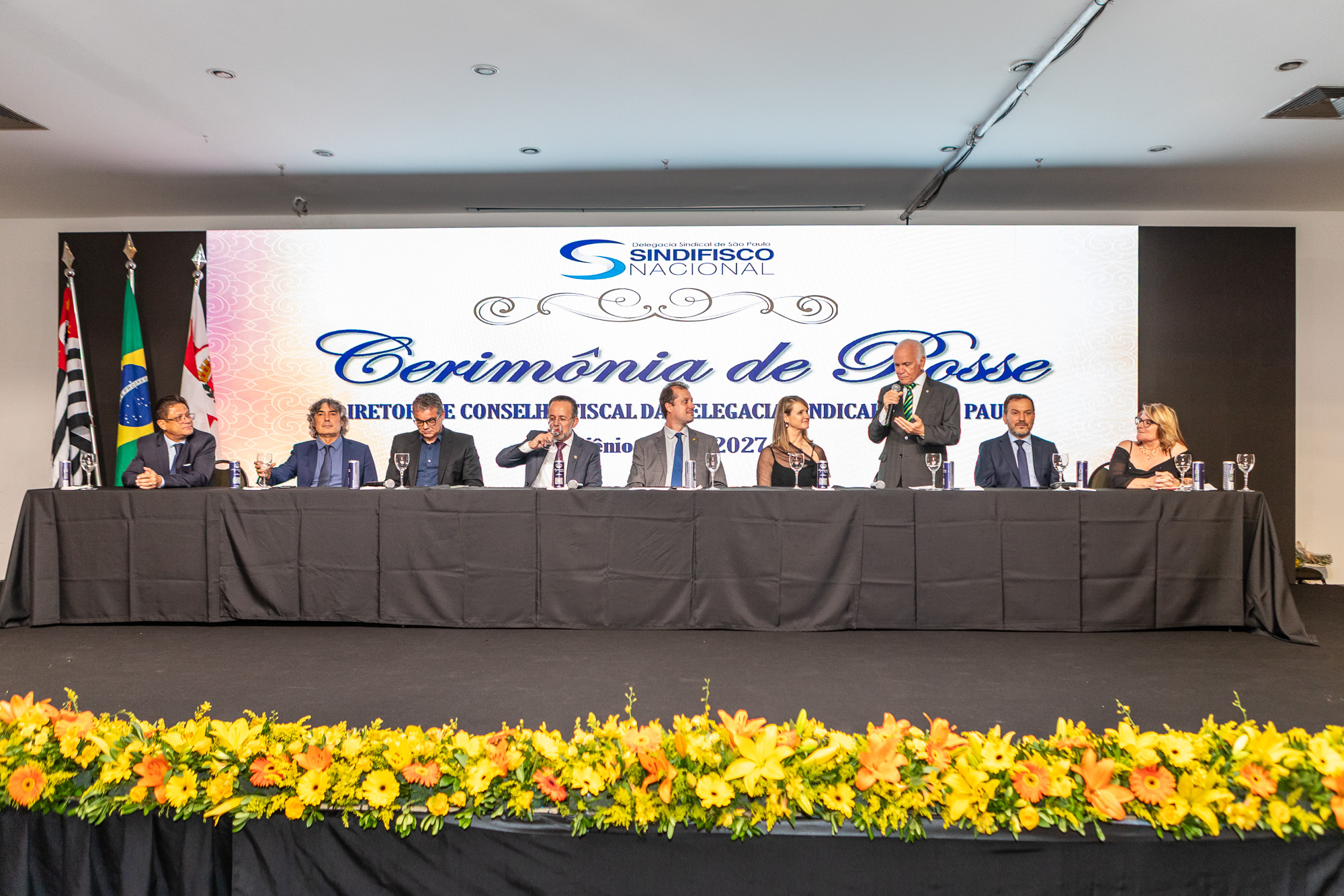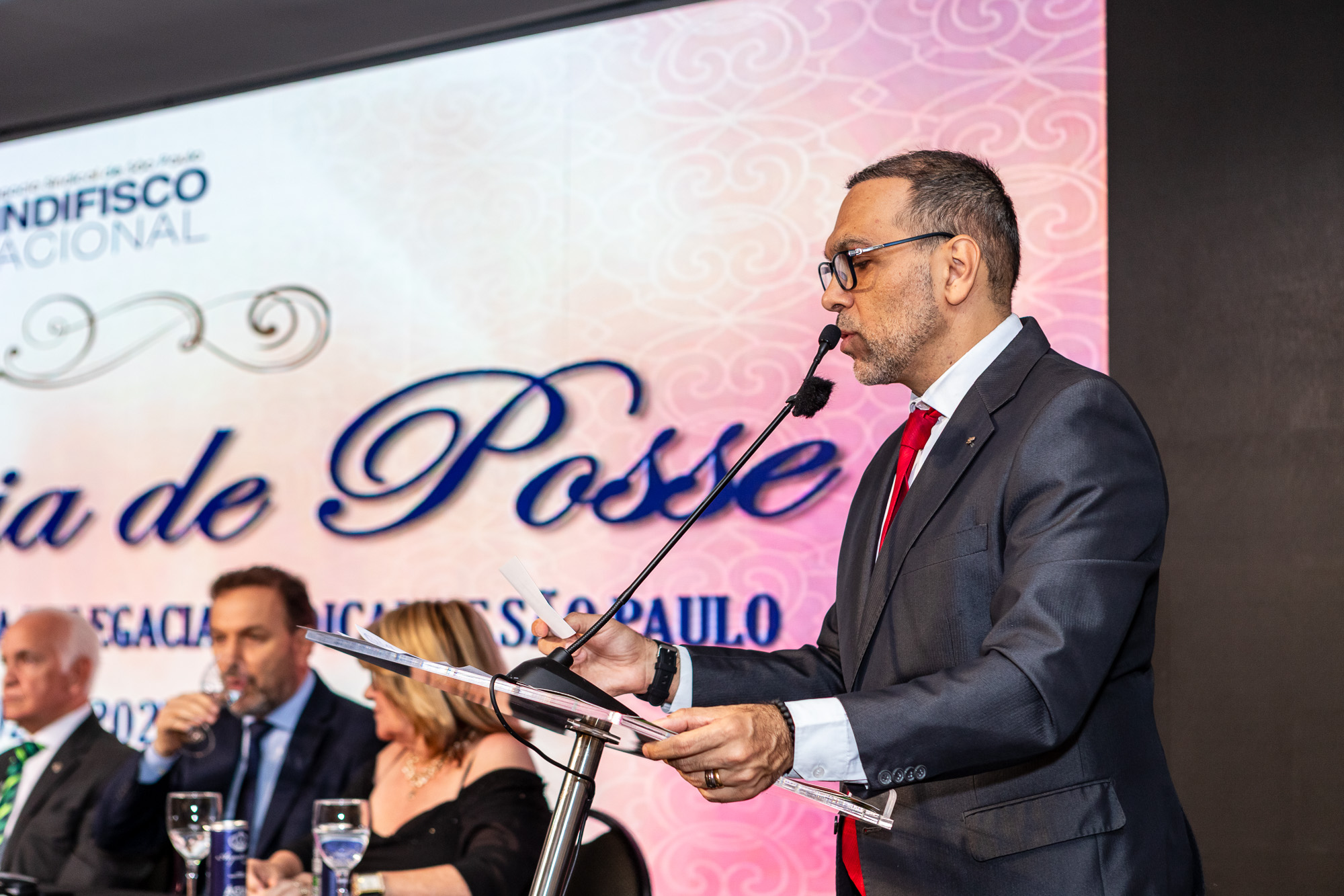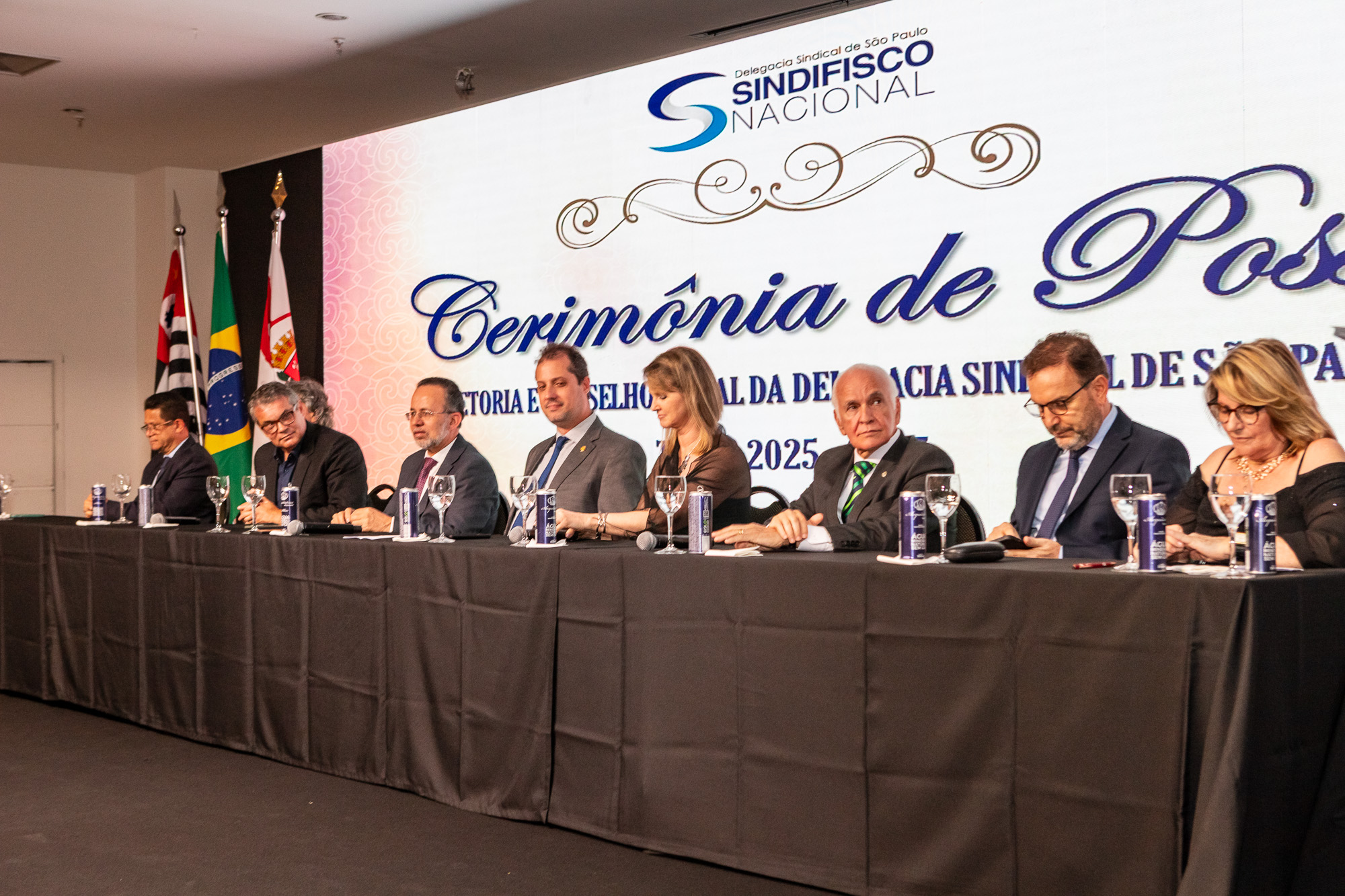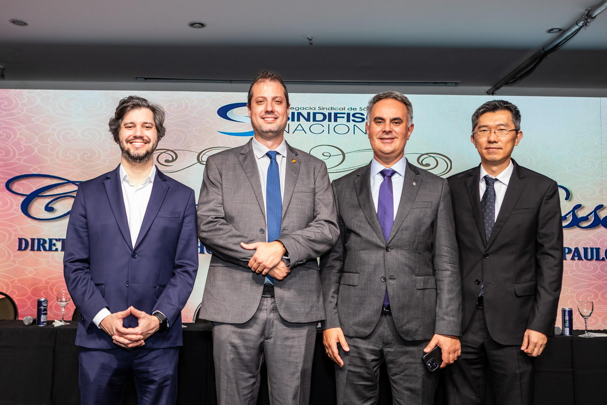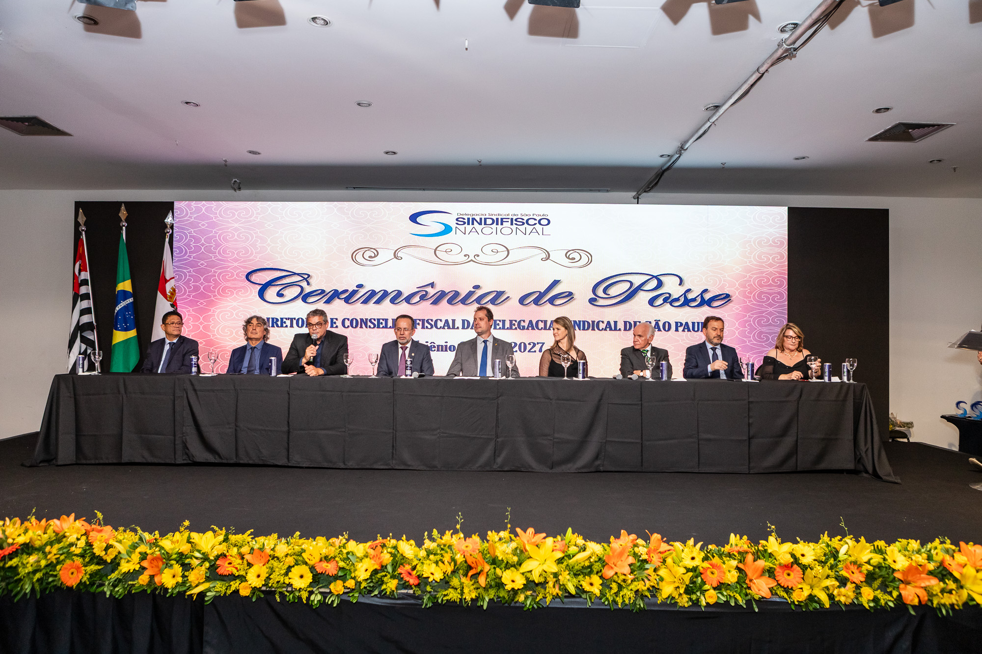Para compor a mesa diretora, foram chamados ao palco o Presidente da DS/SP do Sindifisco Nacional, Auditor-Fiscal Gabriel Rissato Leite Ribeiro; o Presidente da Diretoria Executiva Nacional (DEN) do Sindifisco Nacional, Auditor-Fiscal Dão Real Pereira dos Santos; a Superintendente da 8ª Região Fiscal, Auditora-Fiscal Márcia Cecília Meng; e o Corregedor da Receita Federal, Auditor-Fiscal Guilherme Bibiani Neto.