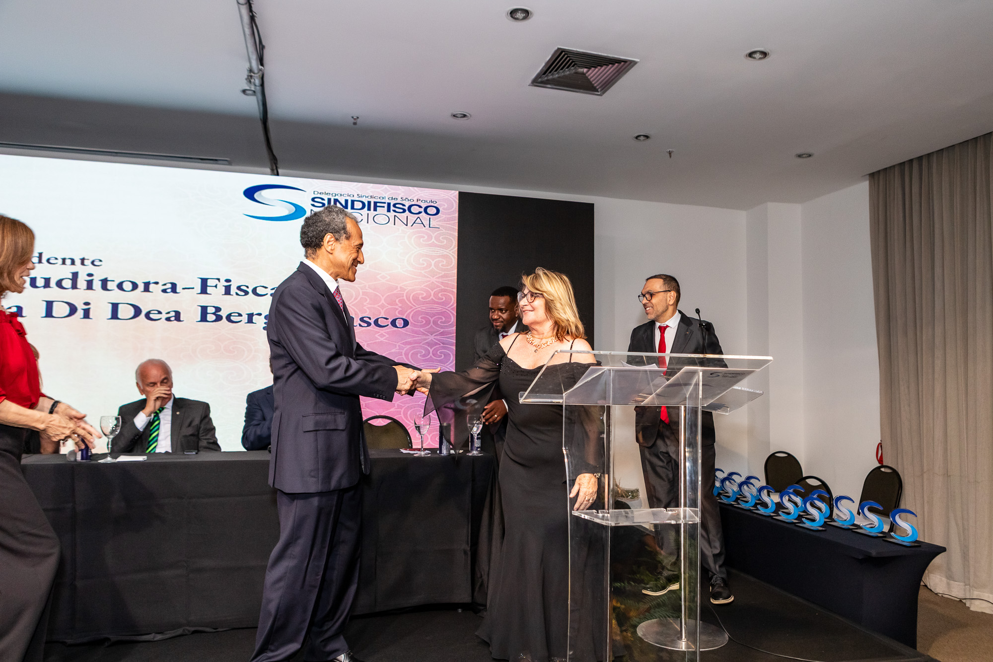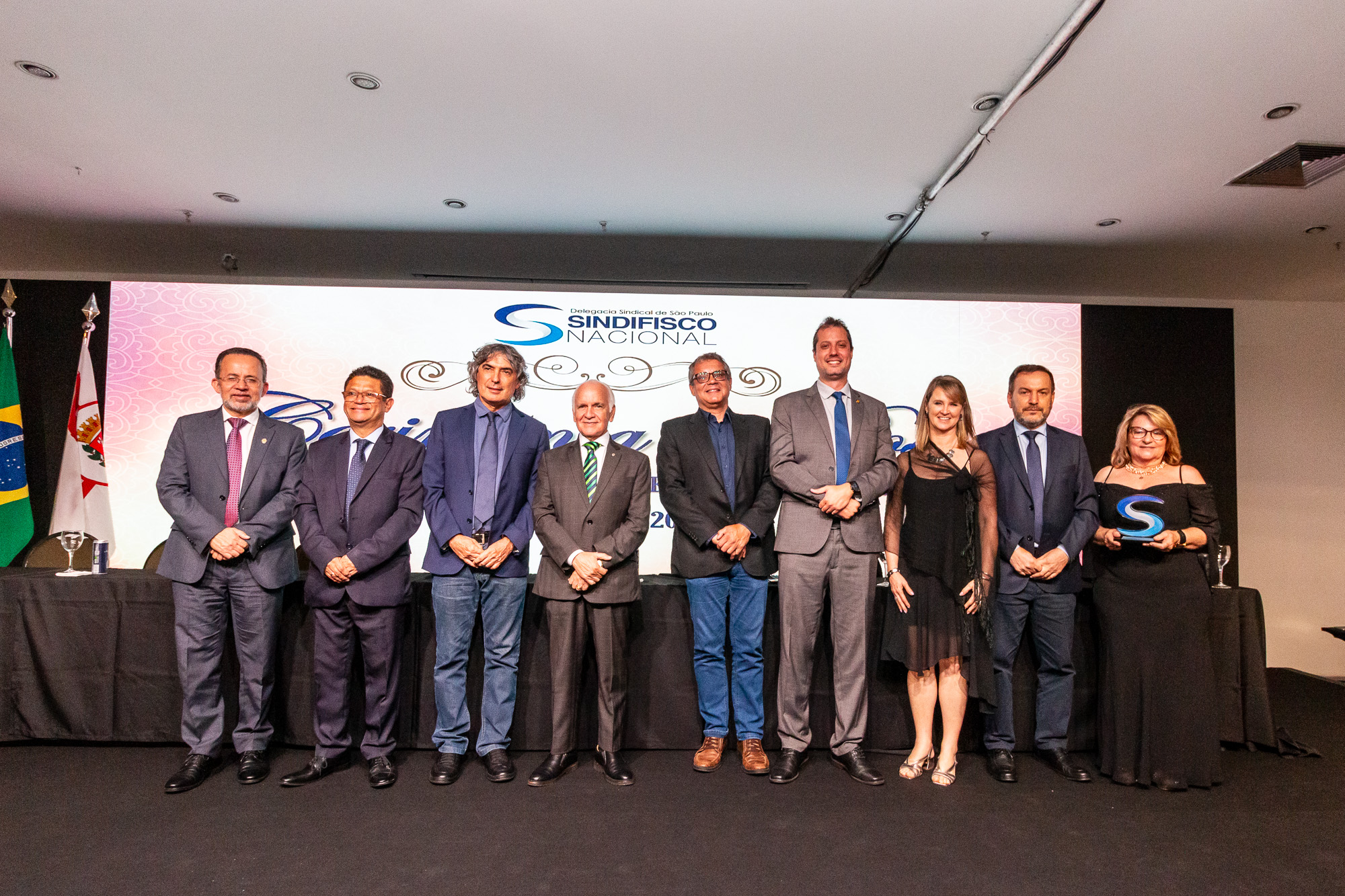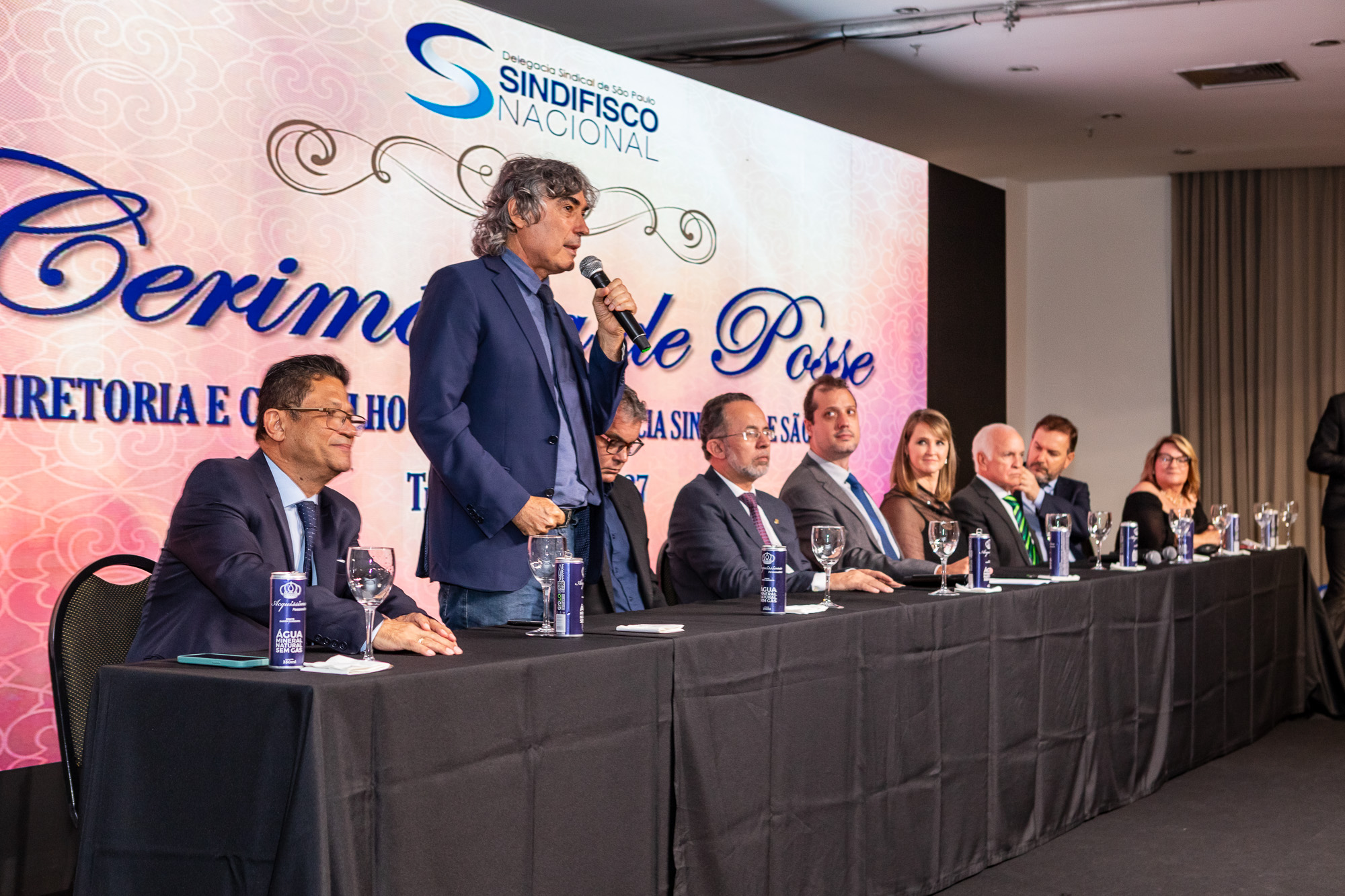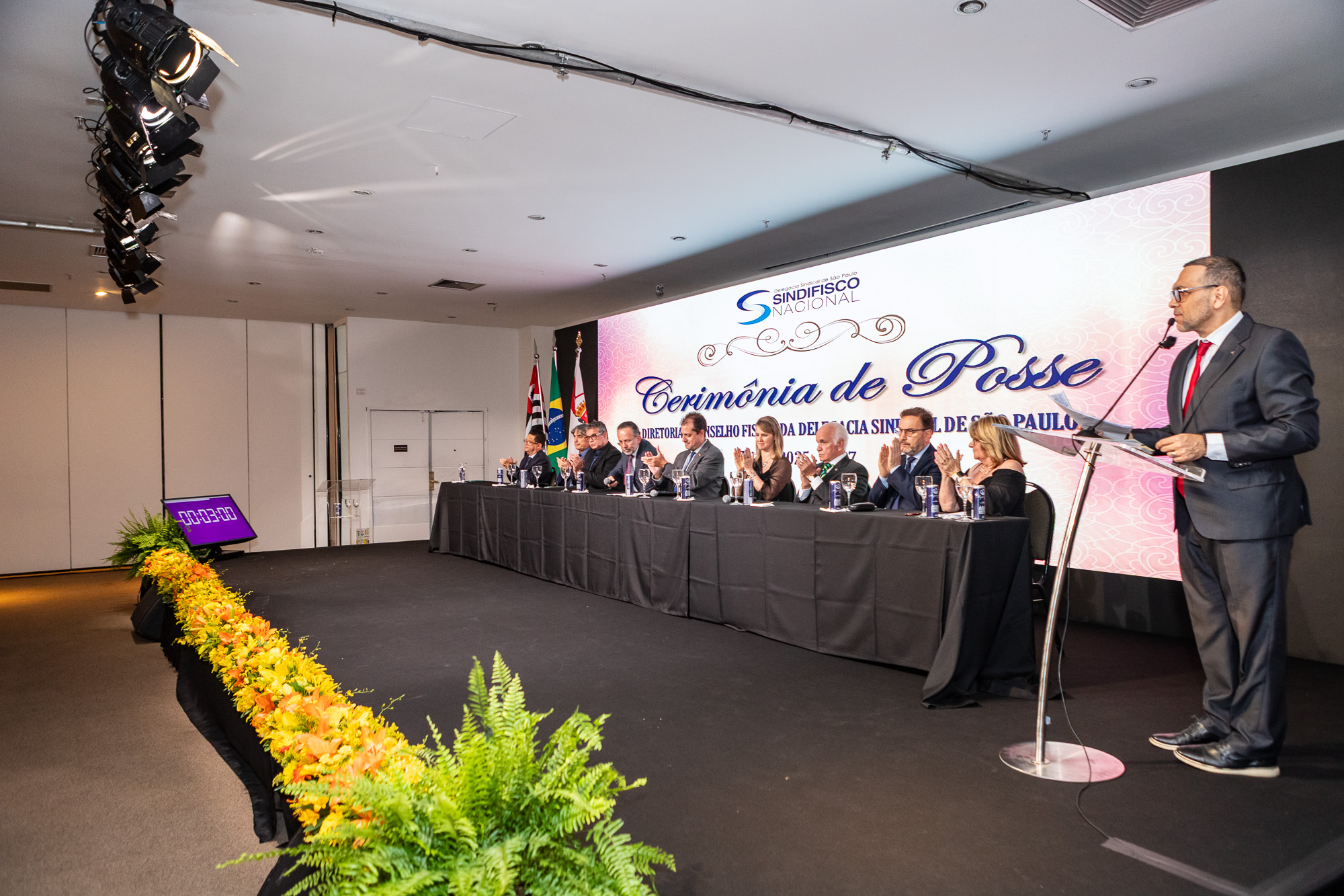 Para compor a mesa diretora, foram chamados ao palco o Presidente da DS/SP do Sindifisco Nacional, Auditor-Fiscal Gabriel Rissato Leite Ribeiro; o Presidente da Diretoria Executiva Nacional (DEN) do Sindifisco Nacional, Auditor-Fiscal Dão Real Pereira dos Santos; a Superintendente da 8ª Região Fiscal, Auditora-Fiscal Márcia Cecília Meng; e o Corregedor da Receita Federal, Auditor-Fiscal Guilherme Bibiani Neto.