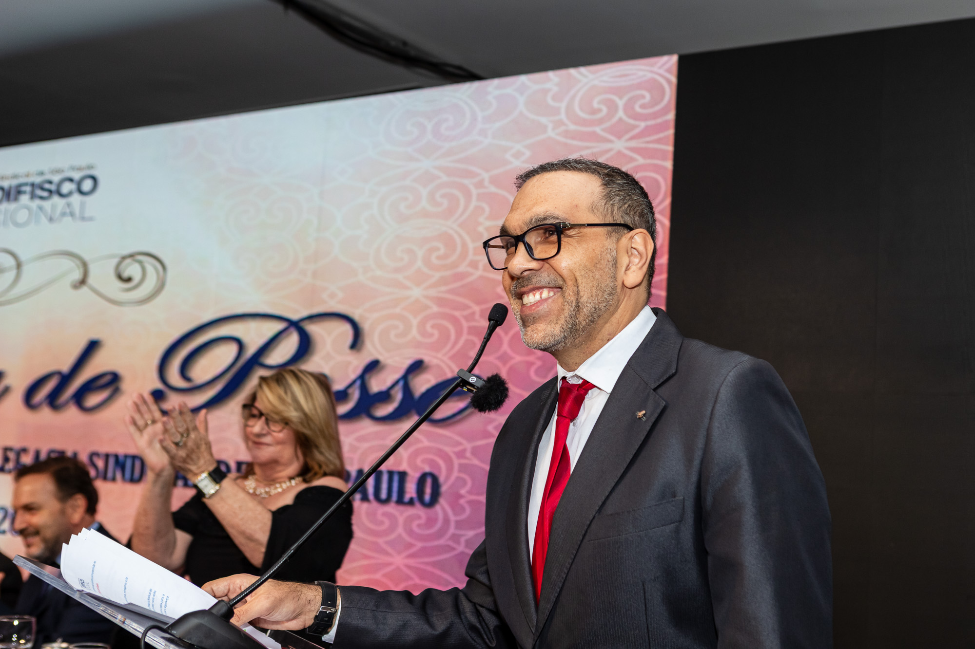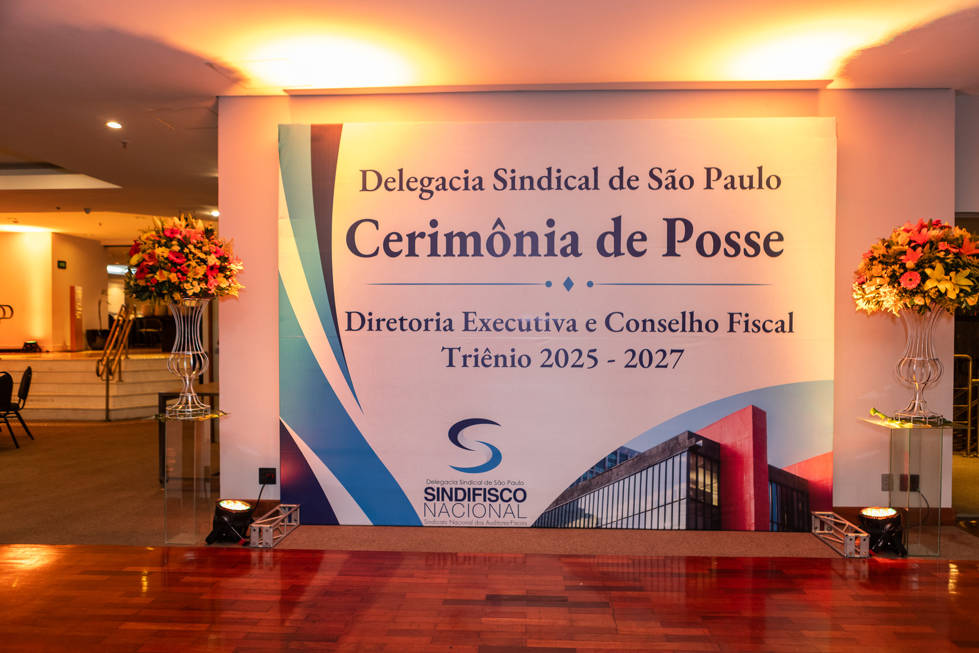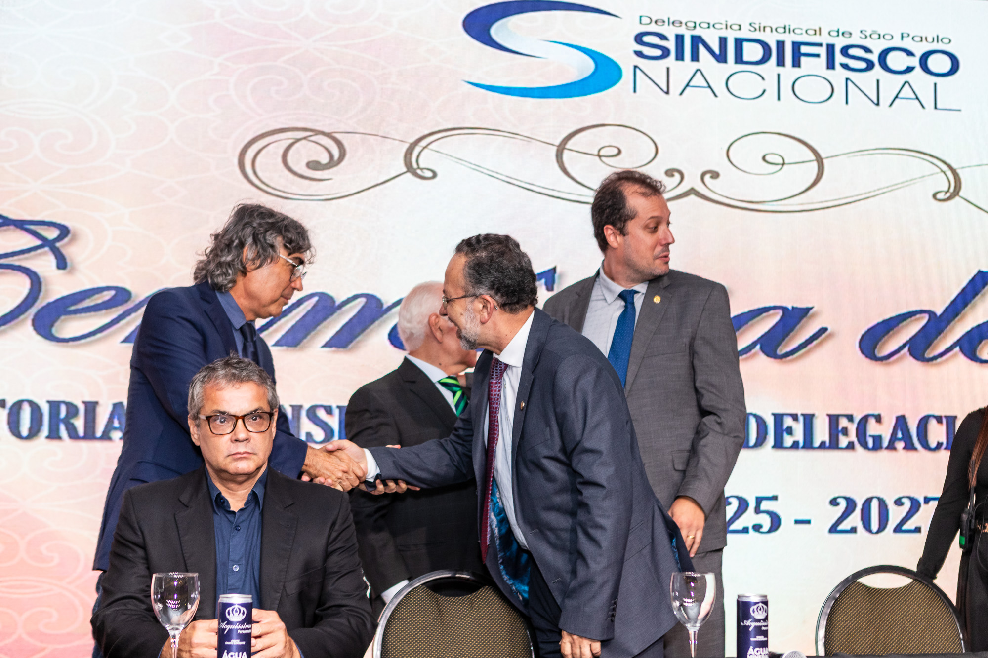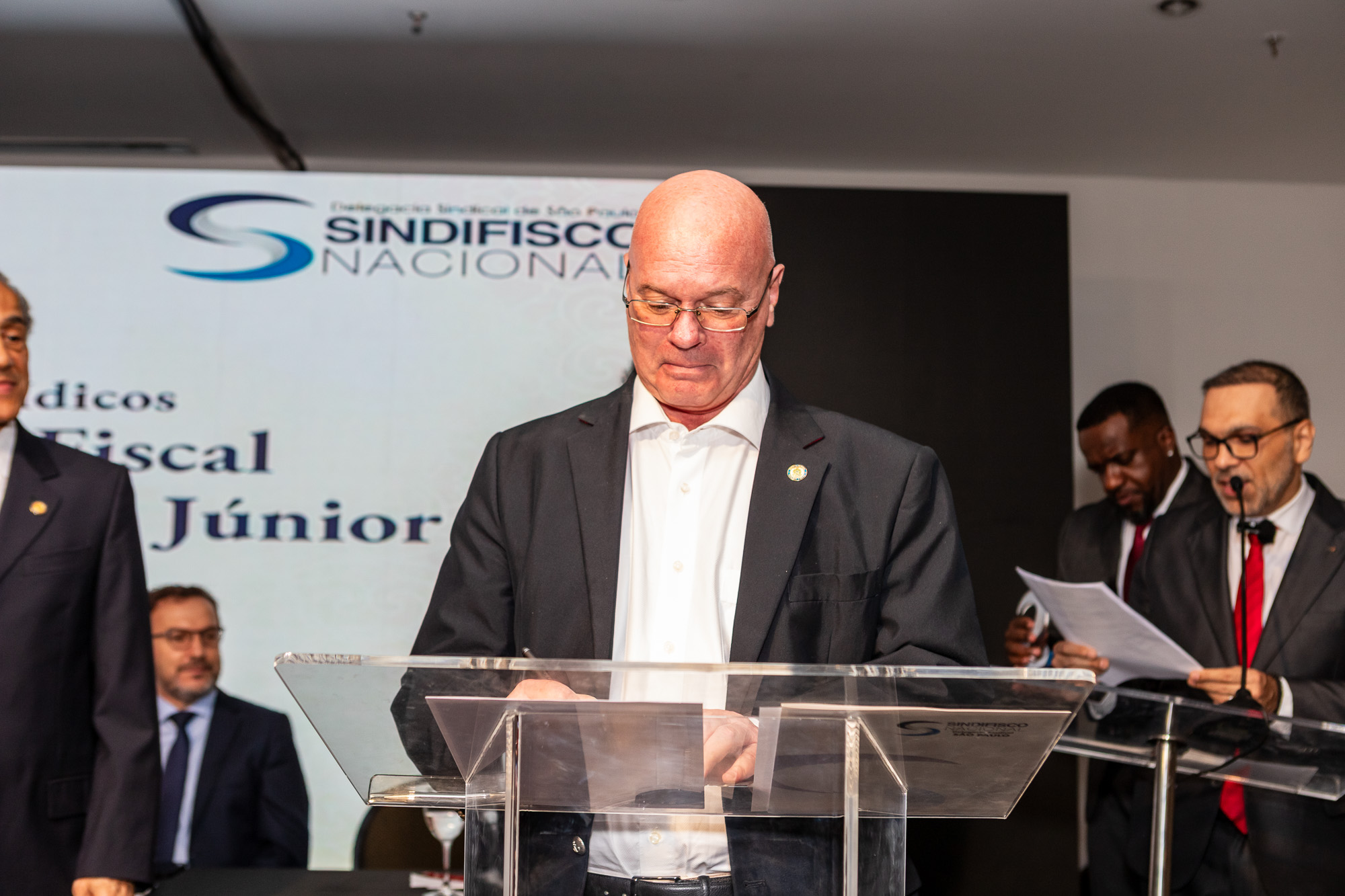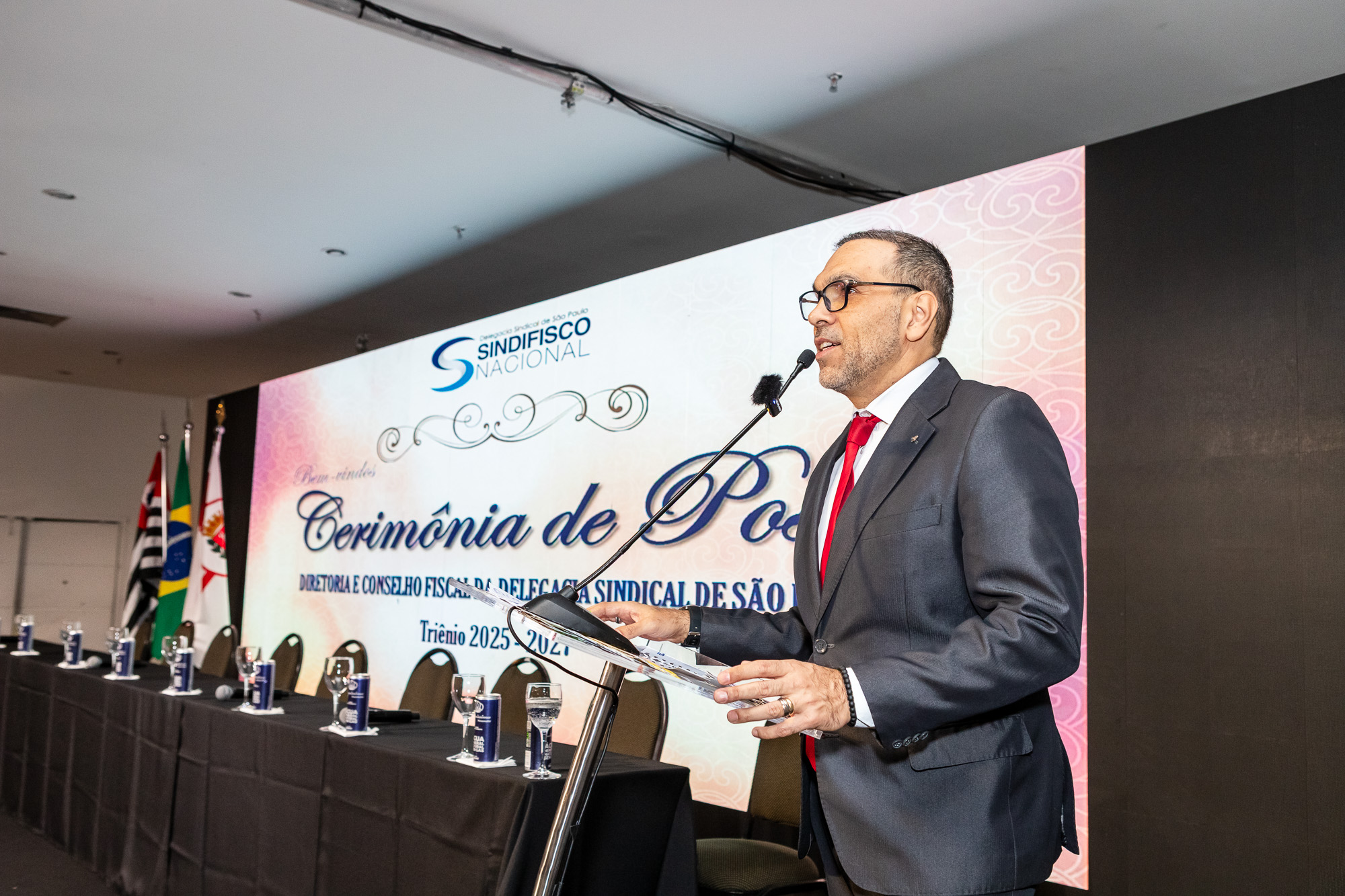 Para compor a mesa diretora, foram chamados ao palco o Presidente da DS/SP do Sindifisco Nacional, Auditor-Fiscal Gabriel Rissato Leite Ribeiro; o Presidente da Diretoria Executiva Nacional (DEN) do Sindifisco Nacional, Auditor-Fiscal Dão Real Pereira dos Santos; a Superintendente da 8ª Região Fiscal, Auditora-Fiscal Márcia Cecília Meng; e o Corregedor da Receita Federal, Auditor-Fiscal Guilherme Bibiani Neto.
