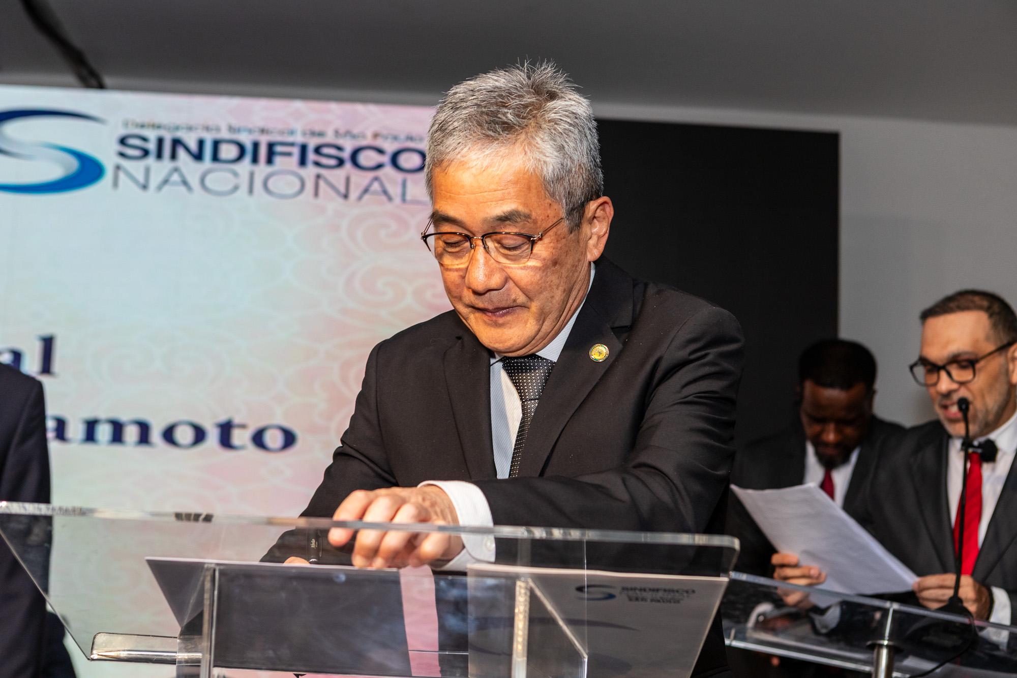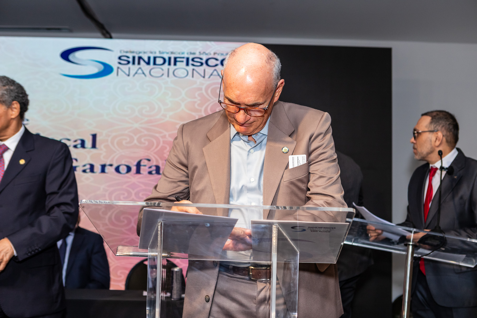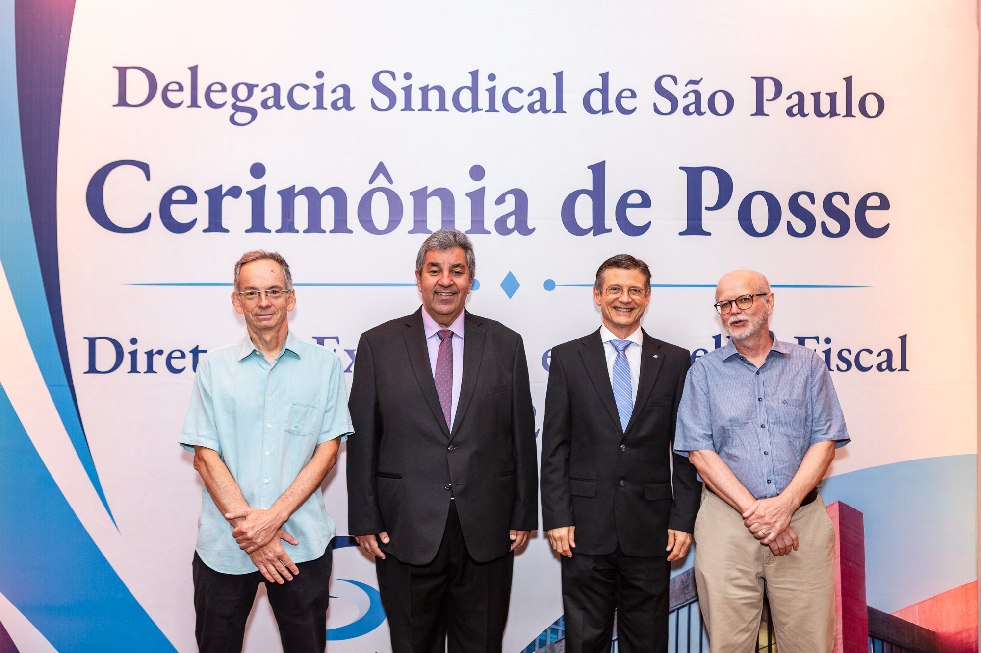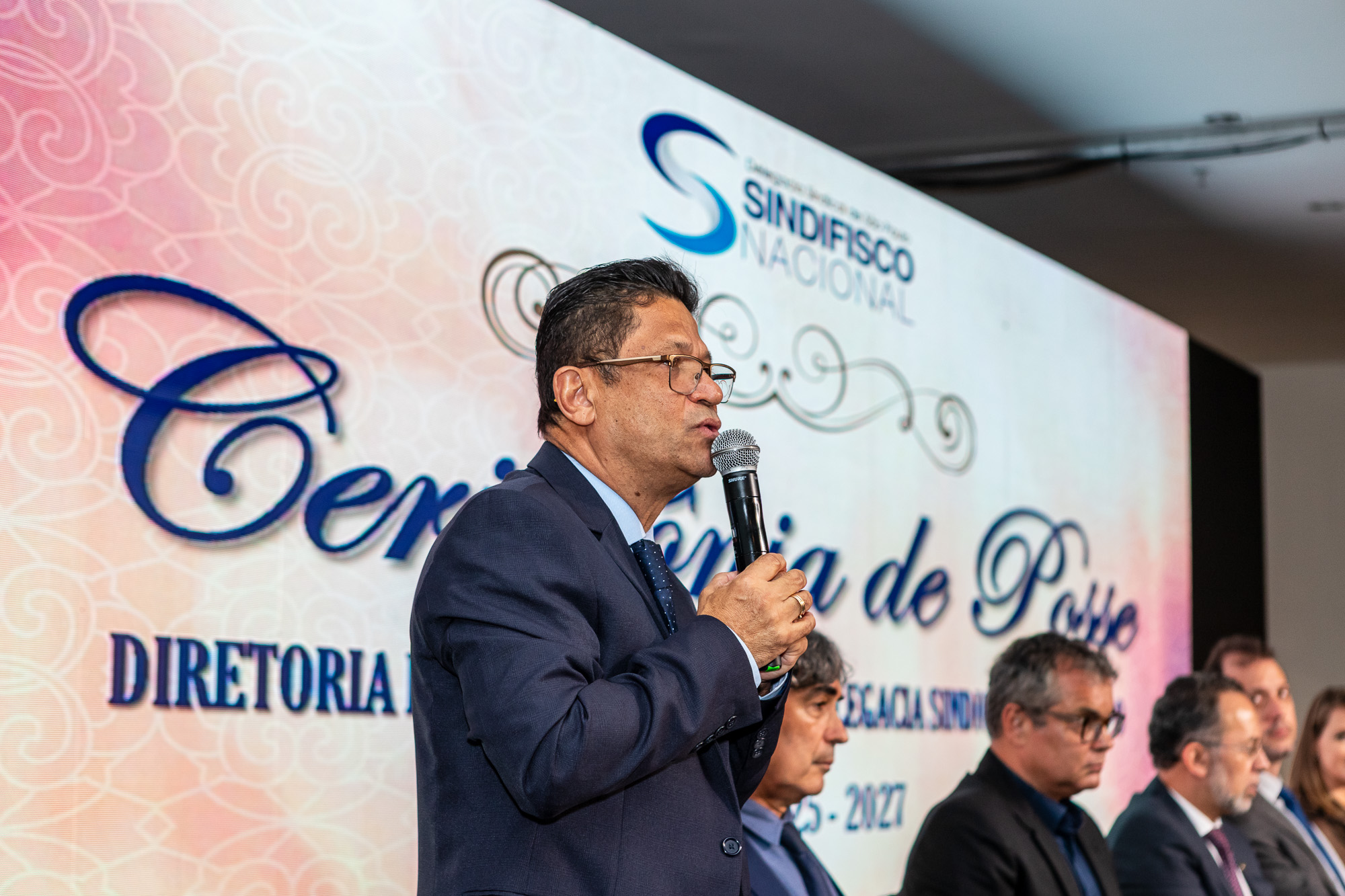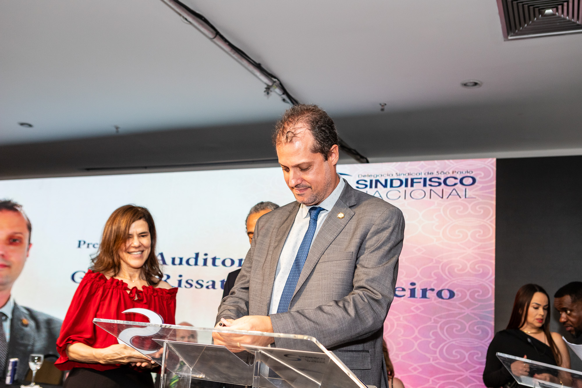Para compor a mesa diretora, foram chamados ao palco o Presidente da DS/SP do Sindifisco Nacional, Auditor-Fiscal Gabriel Rissato Leite Ribeiro; o Presidente da Diretoria Executiva Nacional (DEN) do Sindifisco Nacional, Auditor-Fiscal Dão Real Pereira dos Santos; a Superintendente da 8ª Região Fiscal, Auditora-Fiscal Márcia Cecília Meng; e o Corregedor da Receita Federal, Auditor-Fiscal Guilherme Bibiani Neto.