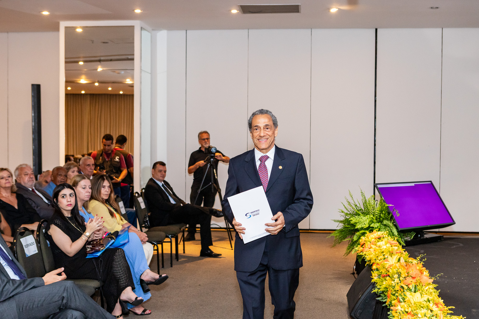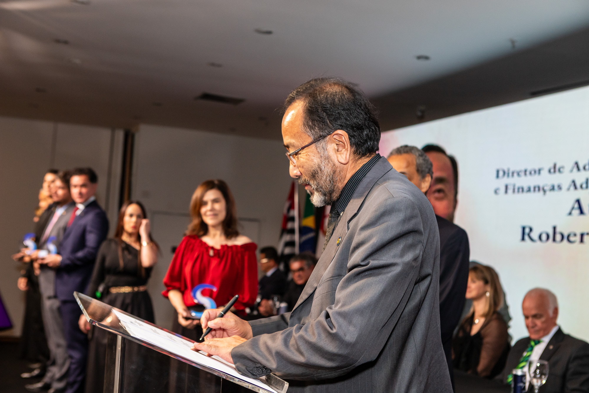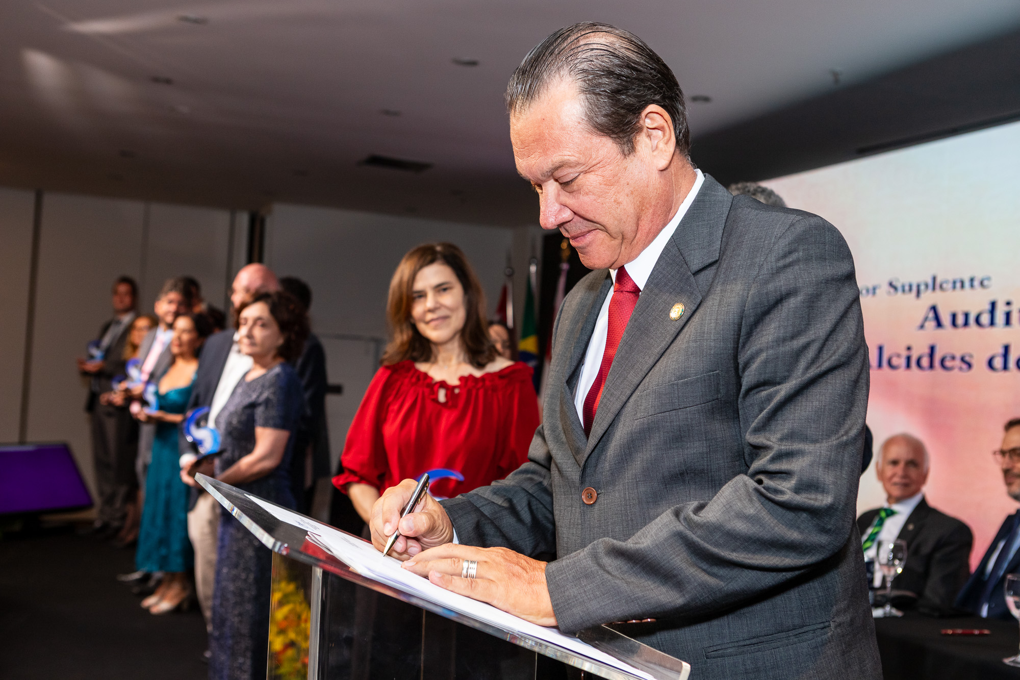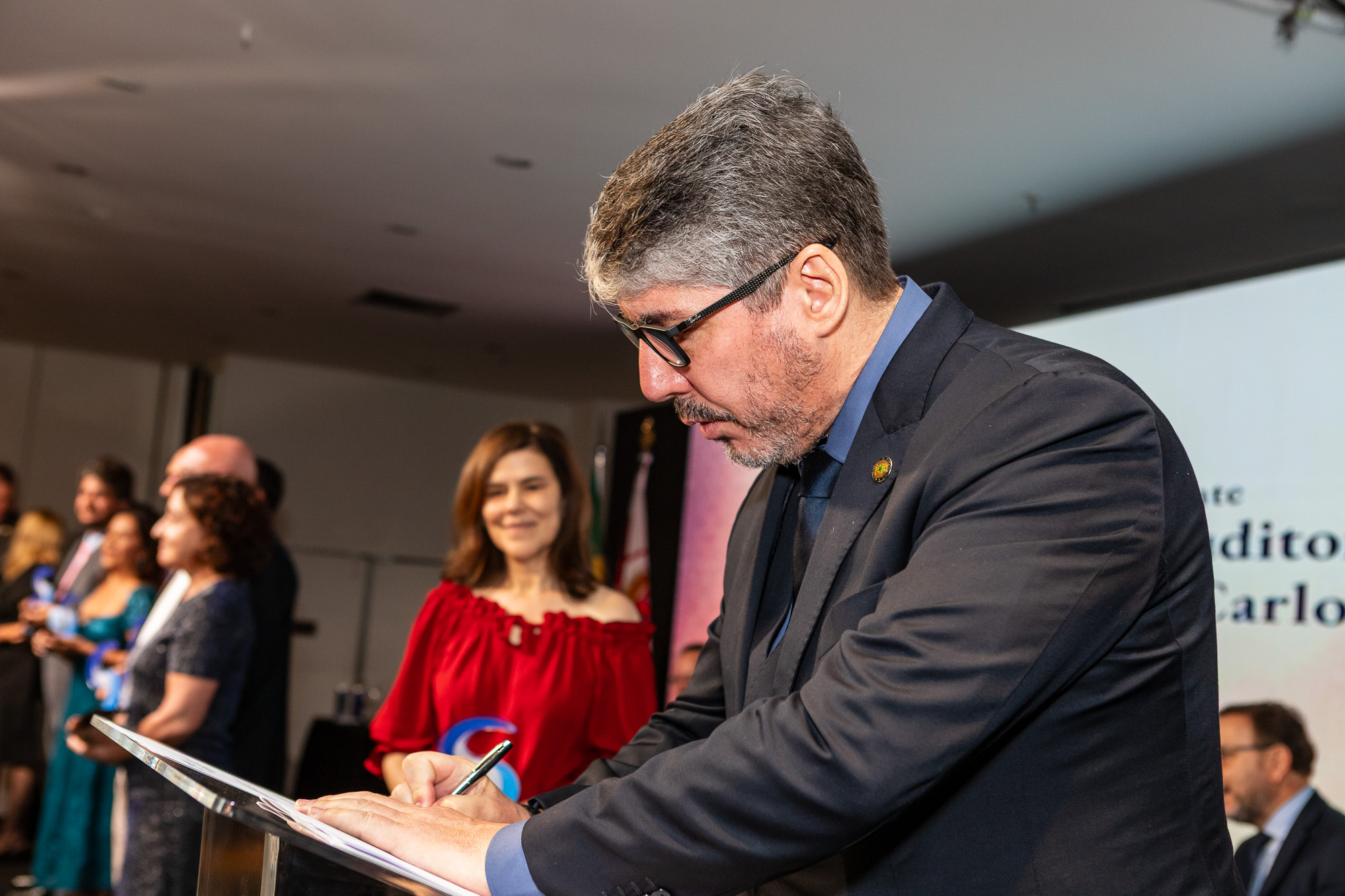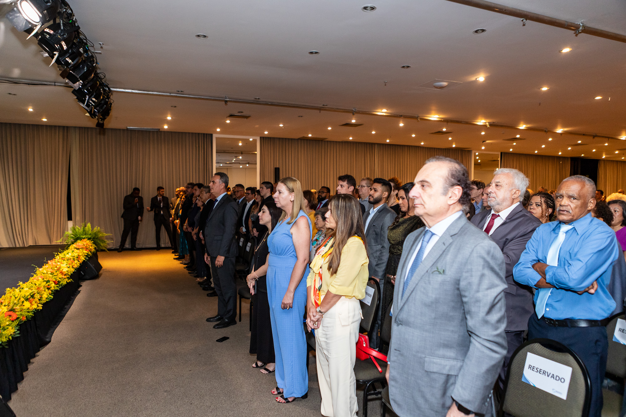 Para compor a mesa diretora, foram chamados ao palco o Presidente da DS/SP do Sindifisco Nacional, Auditor-Fiscal Gabriel Rissato Leite Ribeiro; o Presidente da Diretoria Executiva Nacional (DEN) do Sindifisco Nacional, Auditor-Fiscal Dão Real Pereira dos Santos; a Superintendente da 8ª Região Fiscal, Auditora-Fiscal Márcia Cecília Meng; e o Corregedor da Receita Federal, Auditor-Fiscal Guilherme Bibiani Neto.