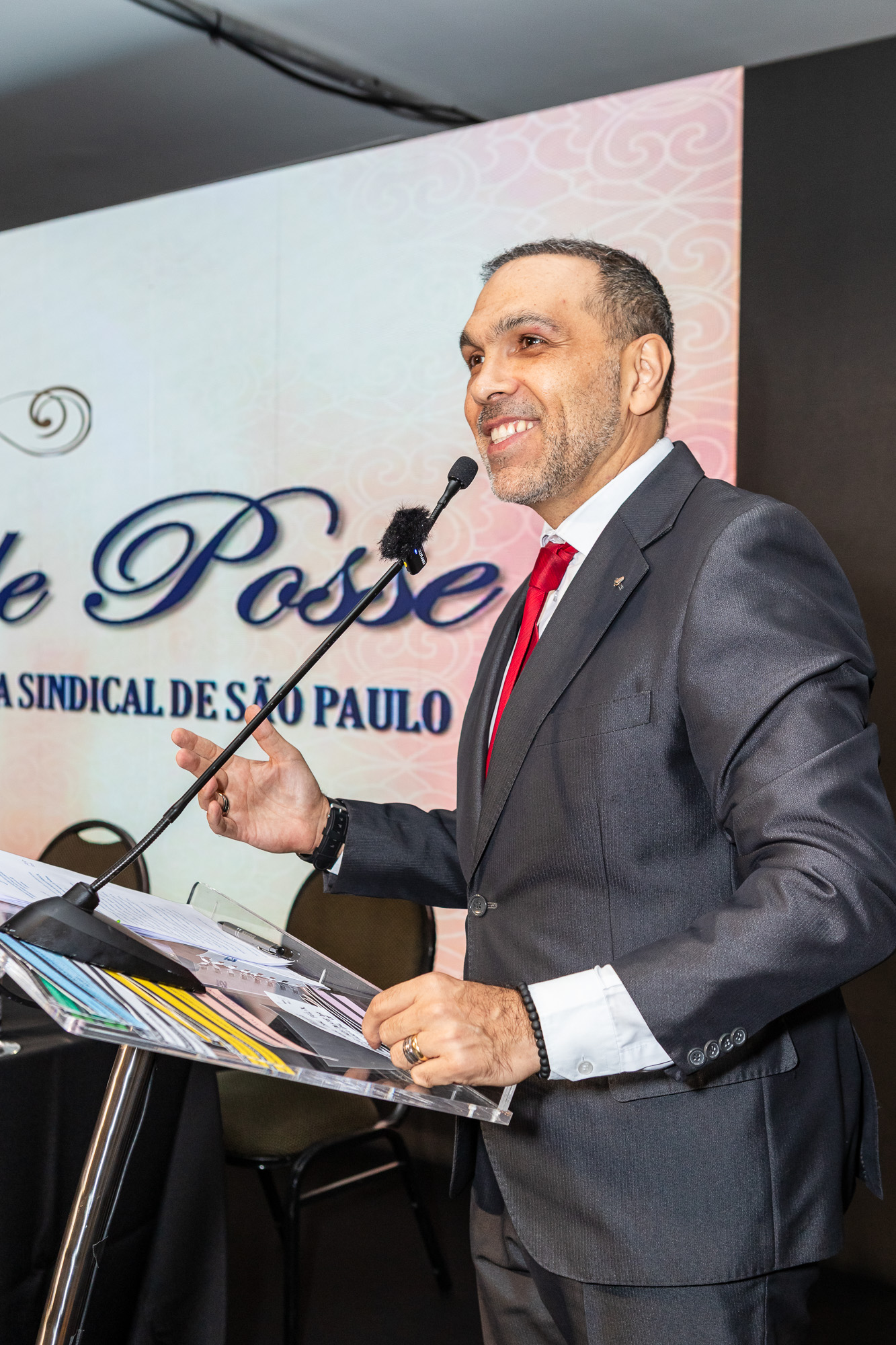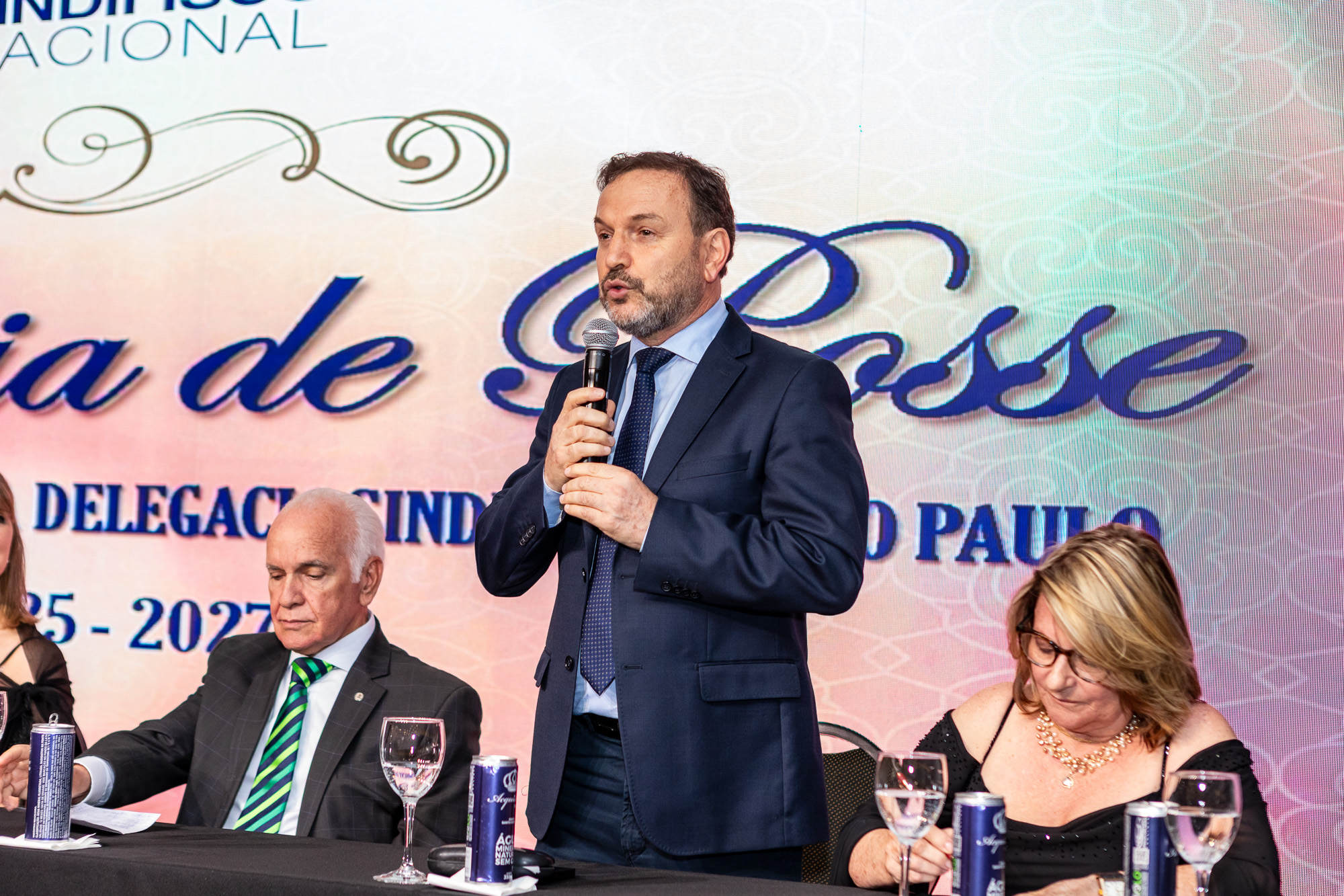 Em seu discurso oficial, o Presidente da DS/SP, Auditor-Fiscal Gabriel Rissato, enfatizou a importância do momento e a responsabilidade de estar à frente da entidade. “É uma responsabilidade gigantesca representar um número tão grande de autoridades fiscais”, afirmou, agradecendo a confiança depositada pelos colegas e mencionando nominalmente os membros da nova Diretoria Executiva. Ele reforçou o papel do sindicato na defesa da categoria e a relevância do trabalho coletivo.