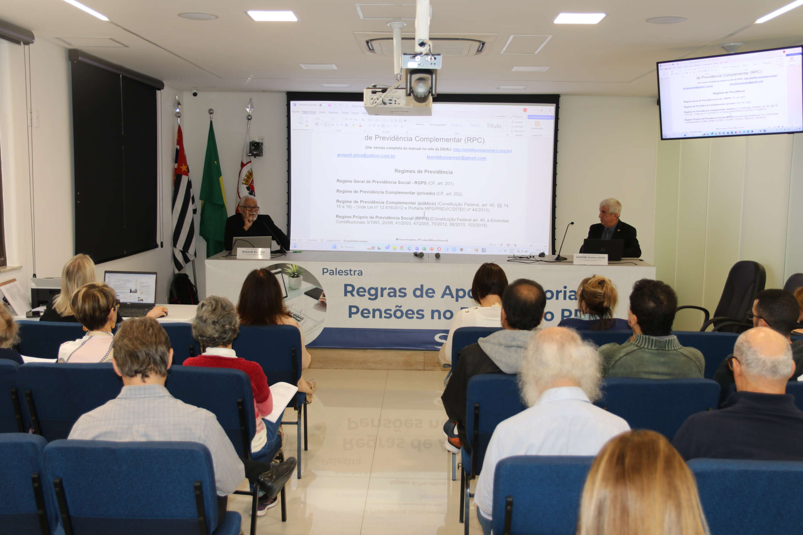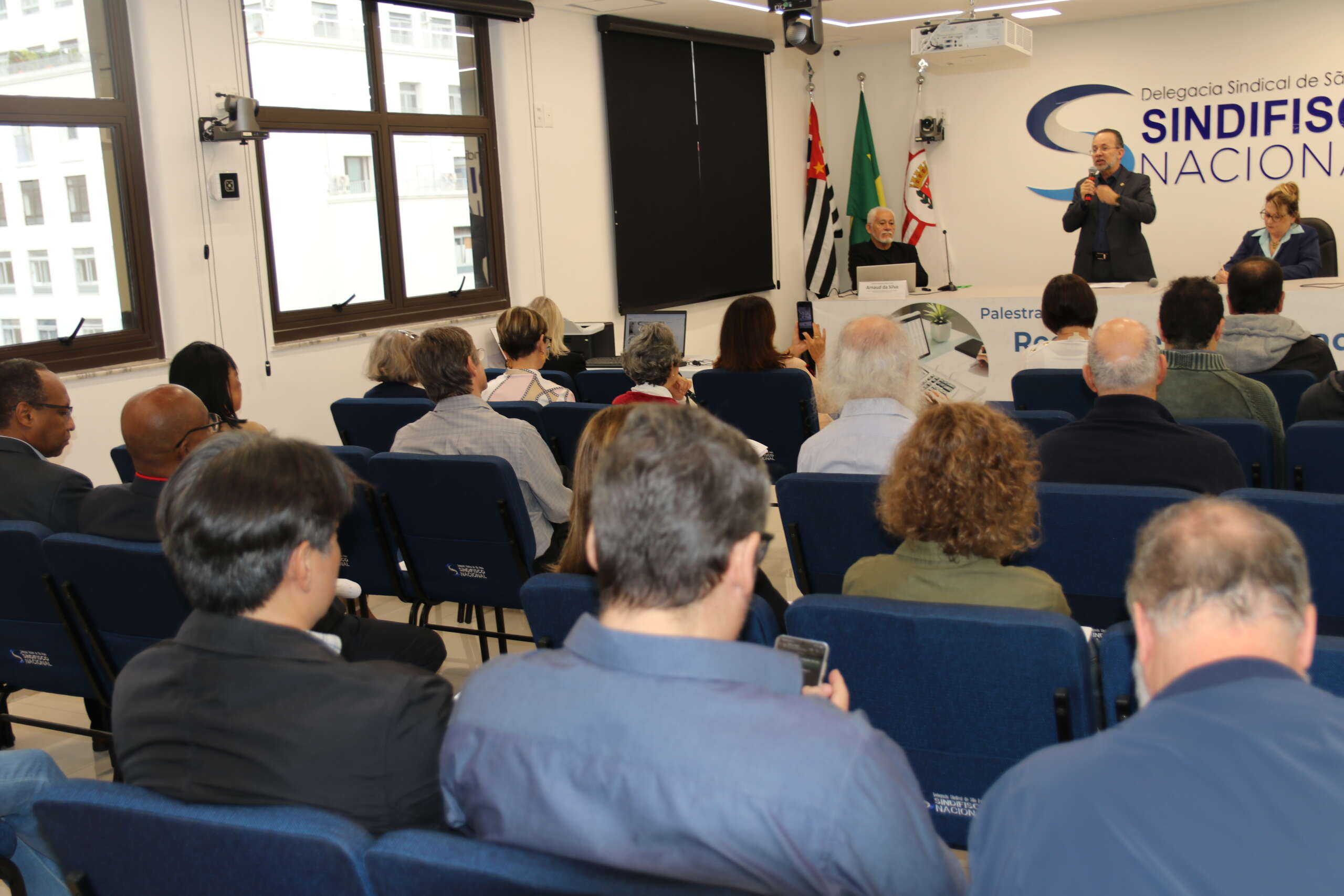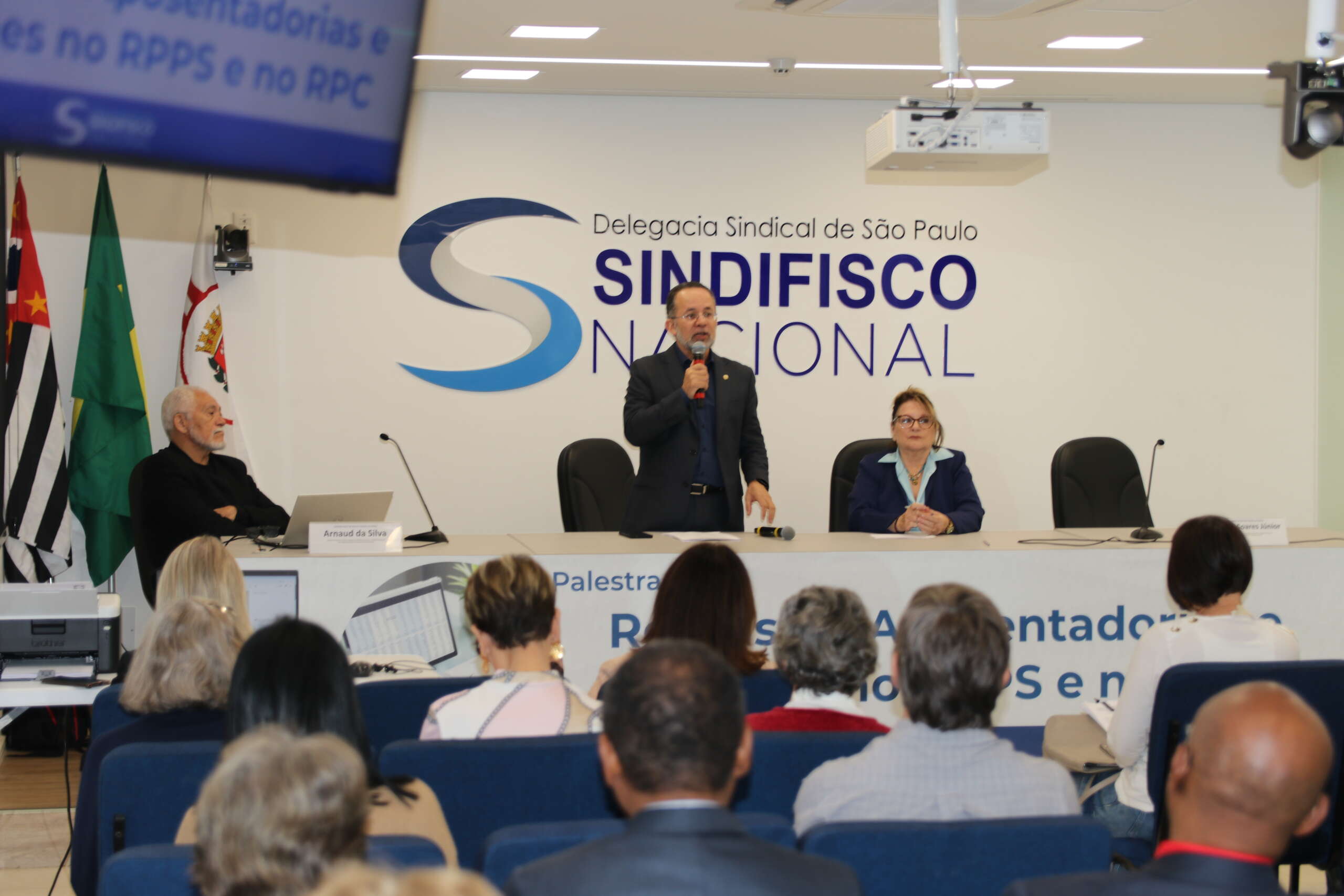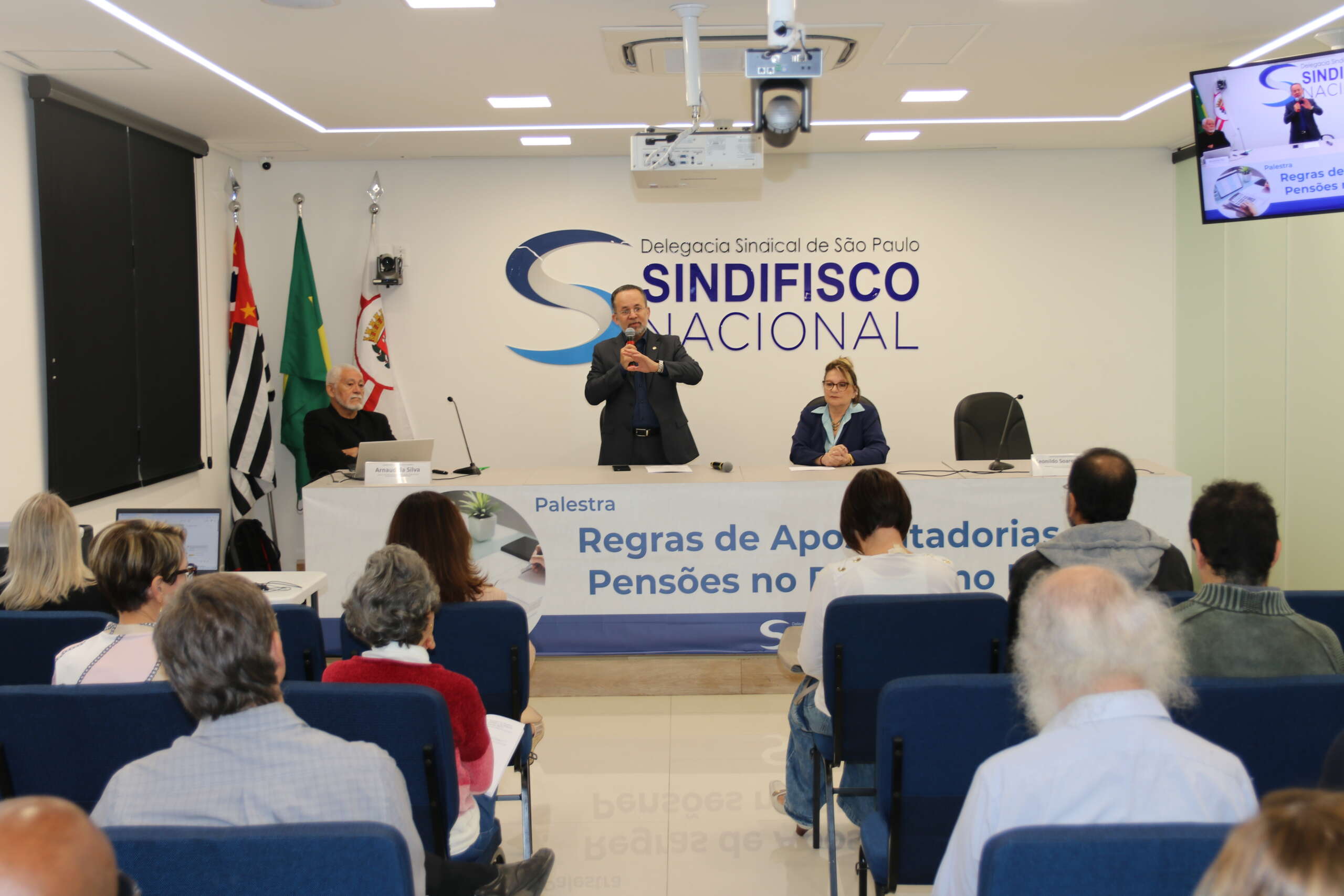 Na última quarta-feira (23), cerca de 50 Auditores-Fiscais ativos e aposentados acompanharam presencialmente a palestra: “Regras de Aposentadorias e Pensões no Regime Próprio de Previdência Social (RPPS) e no Regime de Previdência Complementar (RPC)” na sede da DS São Paulo.