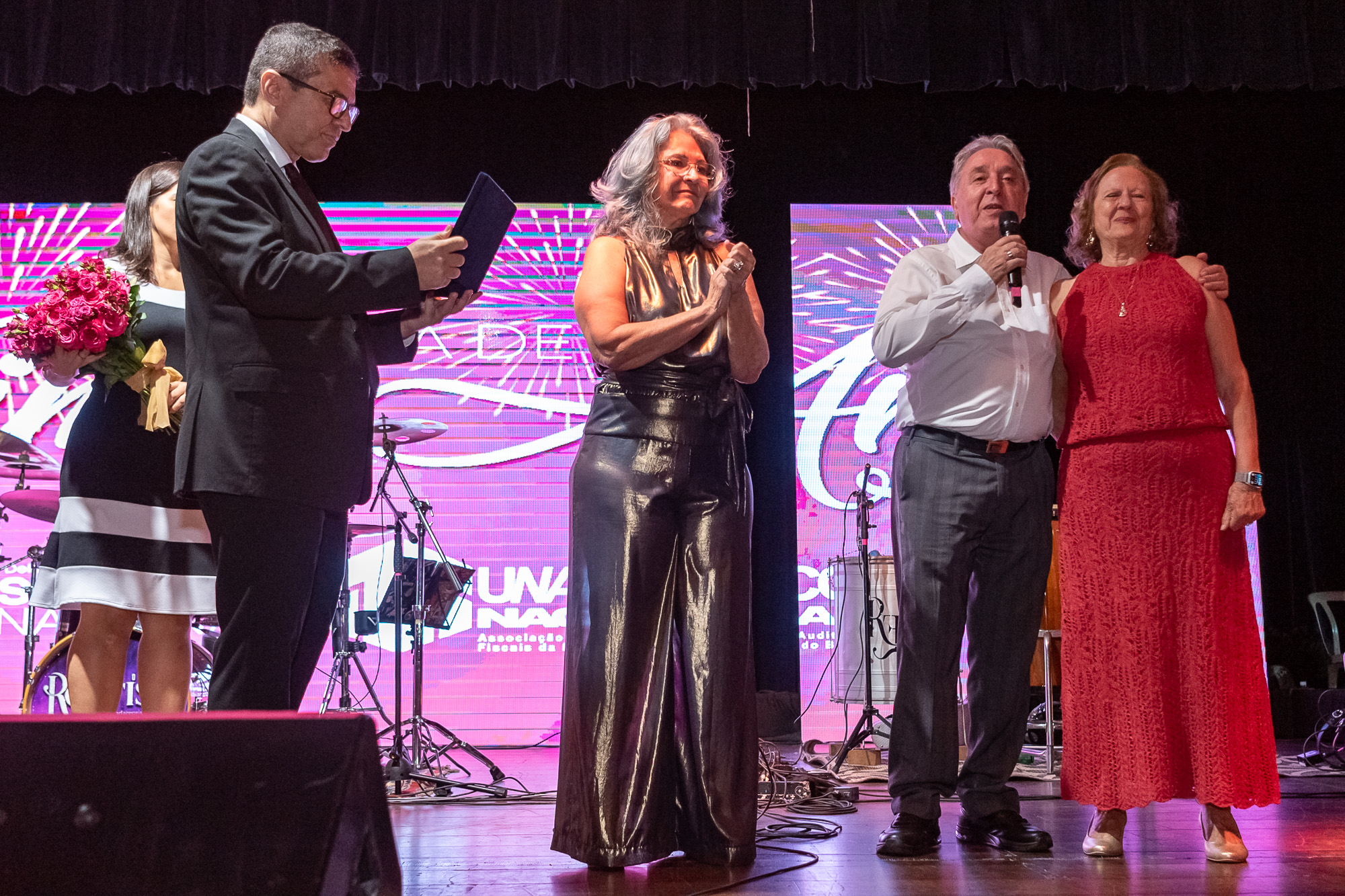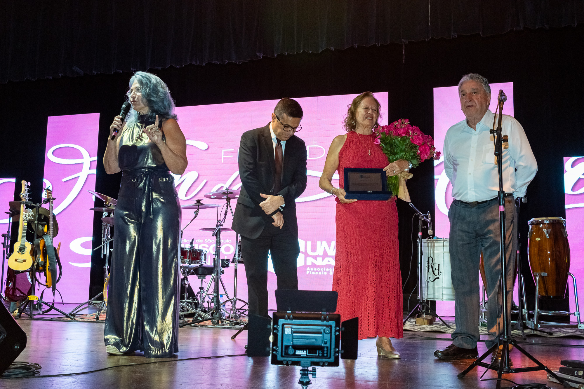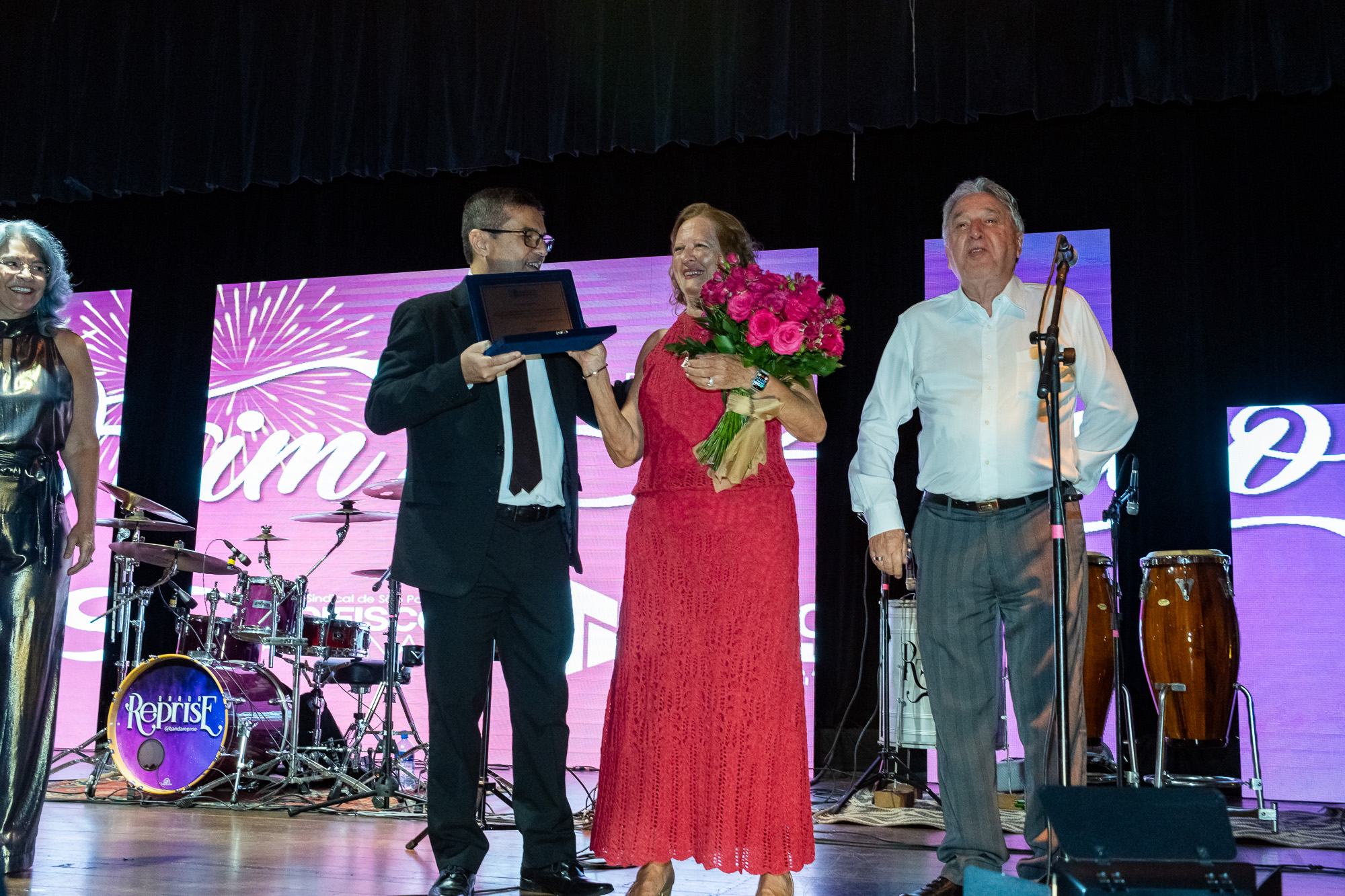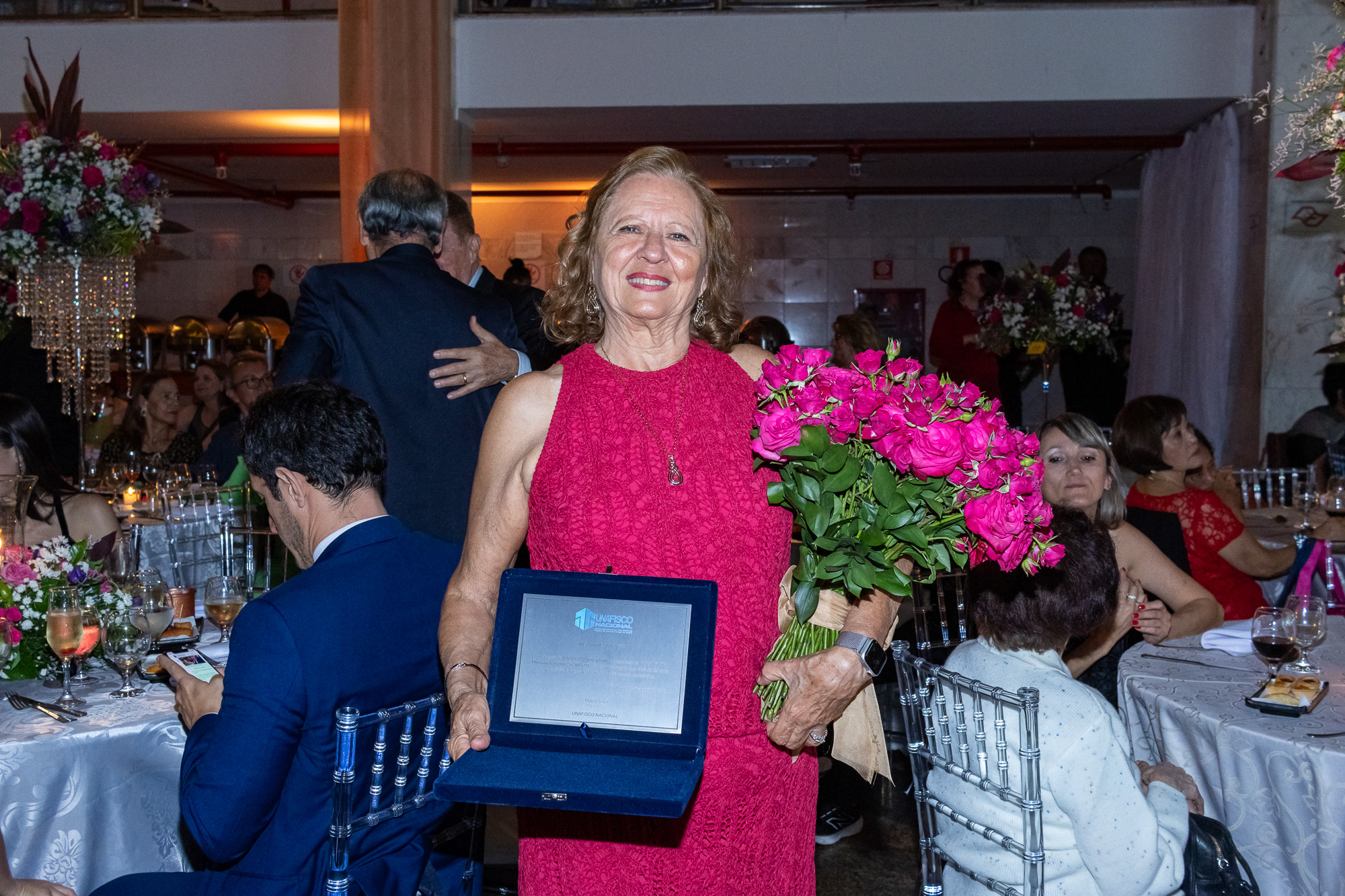 Um dos momentos mais emocionantes da noite foi a homenagem à Lucia Caratti, que após 32 anos de dedicação à Unafisco, se despede da instituição. A colaboradora recebeu flores e uma placa em reconhecimento ao seu trabalho à frente do departamento de convênios.